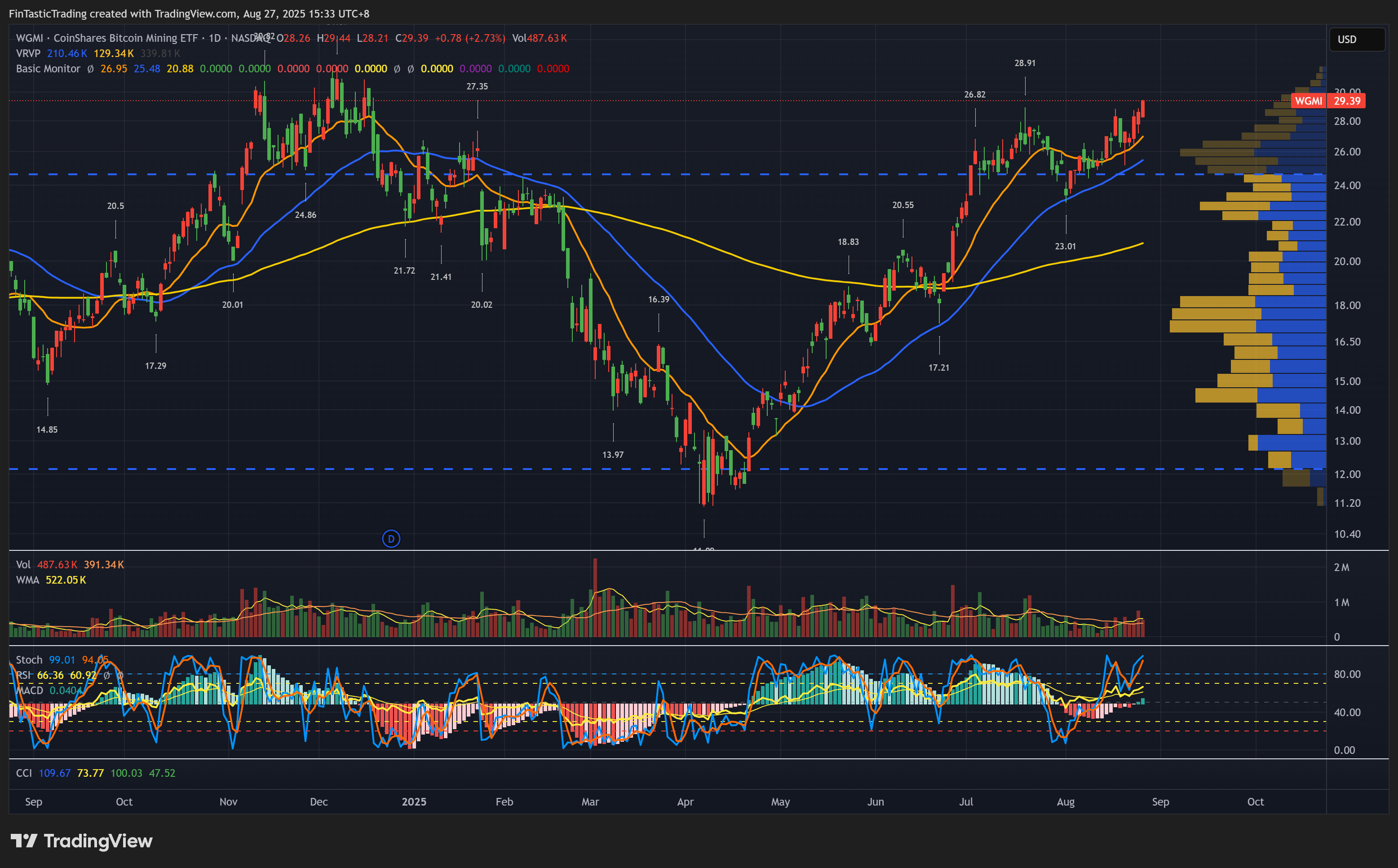 在這樣的背景下,有一檔 ETF 自 4 月以來表現搶眼——WGMI CoinShares Bitcoin Miners ETF。它聚焦比特幣挖礦與 AI 算力兩大賽道,具備高波動、高回報的特性,可以視為「雙倍做多比特幣+AI 算力」的概念股。對於願意承擔風險、追求主題投資機會的積極型投資人,WGMI 無疑是一檔值得關注的標的。