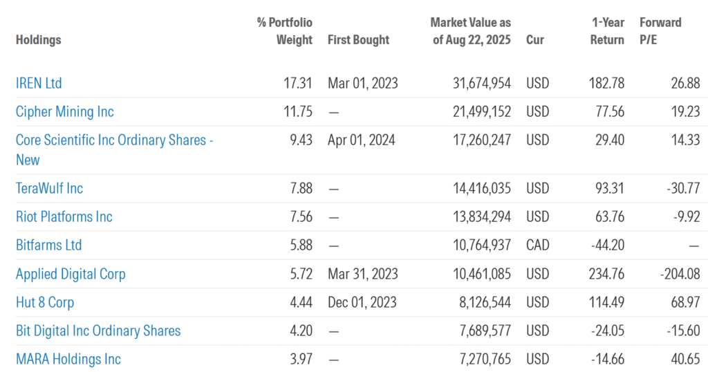 - 最大持股與權重:前五大持股分別是Iris Energy (IREN)約17.3%、Cipher Mining (CIFR)約11.8%、Core Scientific (CORZ)約9.4%、TeraWulf (WULF)約7.9%、Riot Platforms (RIOT)約7.6%。這些權重由基金經理根據研究判斷配置,並非單純依市值等比配置。