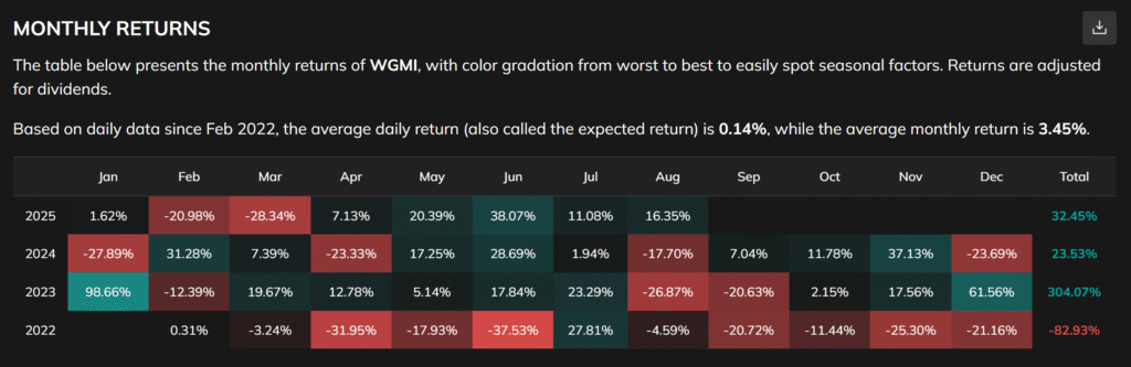 再看長期績效,五年圖表顯示,假設 2022 年投入 1 萬美元,現在 WGMI 僅剩下 12.9% 的累積報酬,而那斯達克同期則有 53.7%。這代表即便 WGMI 在某些年份能出現翻倍甚至三倍的驚人漲幅,但長期平均下來,回報還是大幅落後於大盤。原因在於 WGMI 常常經歷劇烈的回撤,例如 2022 年暴跌、2025 年初大幅修正,這些下跌幾乎吞噬掉之前的漲幅。