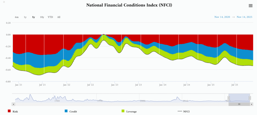 這是一個更宏觀的指標。如果 NFCI 依然處於負值或低位,代表整體金融環境依然寬鬆。在寬鬆的環境下,股市的急殺通常不具備持續性,往往是漲多後的技術性修正。