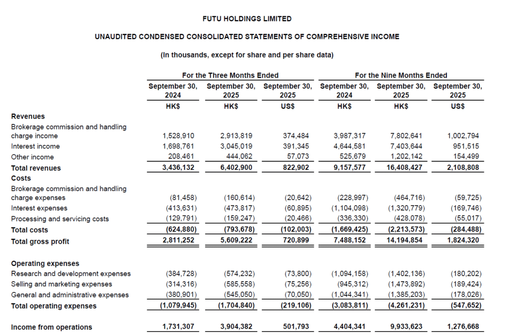 2024 Q4 起,隨著港股與美股轉強,加上新加坡資本市場活躍,Futu 的客戶資產從 2024 年底的 HK$743B 一路升至 2025 Q3 的 HK$1.24T,增幅近 70%。
