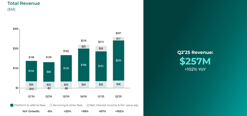 - 個人貸款:3–5 年期無擔保信貸,仍為核心業務。2025 Q2 放款達 26 億美元,年增 143%,且超級 Prime 借款人比重提升至 26%,顯示客群正在升級。