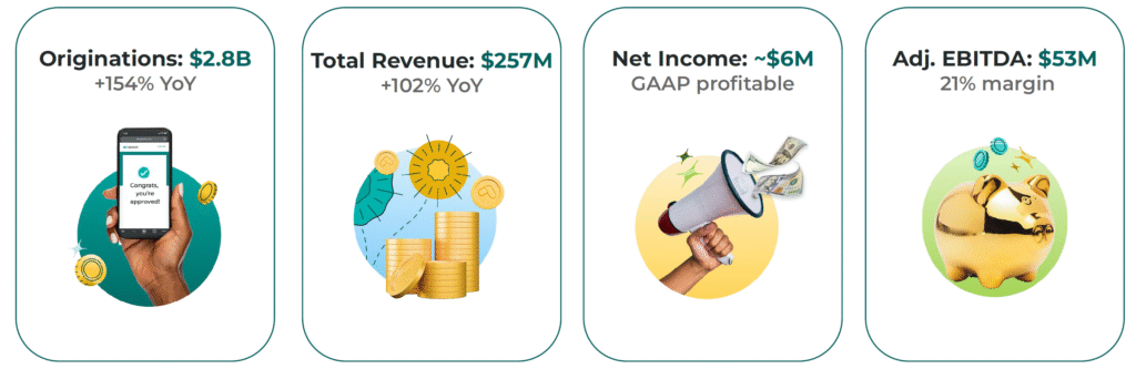 公司預估 2025 全年營收 10.55 億美元(年增 +25%,優於市場預期 10.1 億)。其中平台及服務費佔 9.9 億,淨利息收入 6,500 萬。GAAP 淨利潤目標 3,500 萬,為上市以來首度全年正盈餘;調整後 EBITDA 利潤率約 20%。
