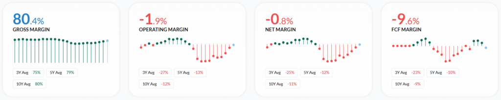 Upstart 屬於 輕資產、高毛利 的平台模式,長期毛利率維持在 80–85%。即便扣除行銷成本後的「貢獻毛利率」約 58%,仍遠高於傳統金融業。隨著 AI 模型降低欺詐損失、交易量擴大帶來規模效益,毛利率具備良好穩定性。即使未來因收費率下降小幅壓縮,只要維持在 50%以上,依舊具吸引力。