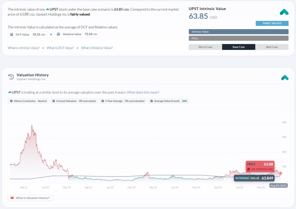 以Alpha Spread 的估值圖顯示,Upstart (UPST) 的合理價值約在 63.85 美元,與當前市價 63.88 美元幾乎一致,屬於「合理估值」(Fairly Valued)的狀態。這個內在價值是由 DCF 模型(55.15 美元)與相對估值(72.54 美元)平均計算而來。從歷史來看,UPST 目前的交易水準與過去 4 年的平均估值接近,顯示市場對其定價並未出現明顯高估或低估。值得注意的是,Alphaspread 給出的 平均價值成長率約 26%,意味著若公司能持續維持成長動能,股價仍有中長期上行的潛力。整體而言,目前股價位置反映市場對基本面的中性態度,未來表現仍需觀察放貸量、資產品質及 AI 模型持續優化的成果。