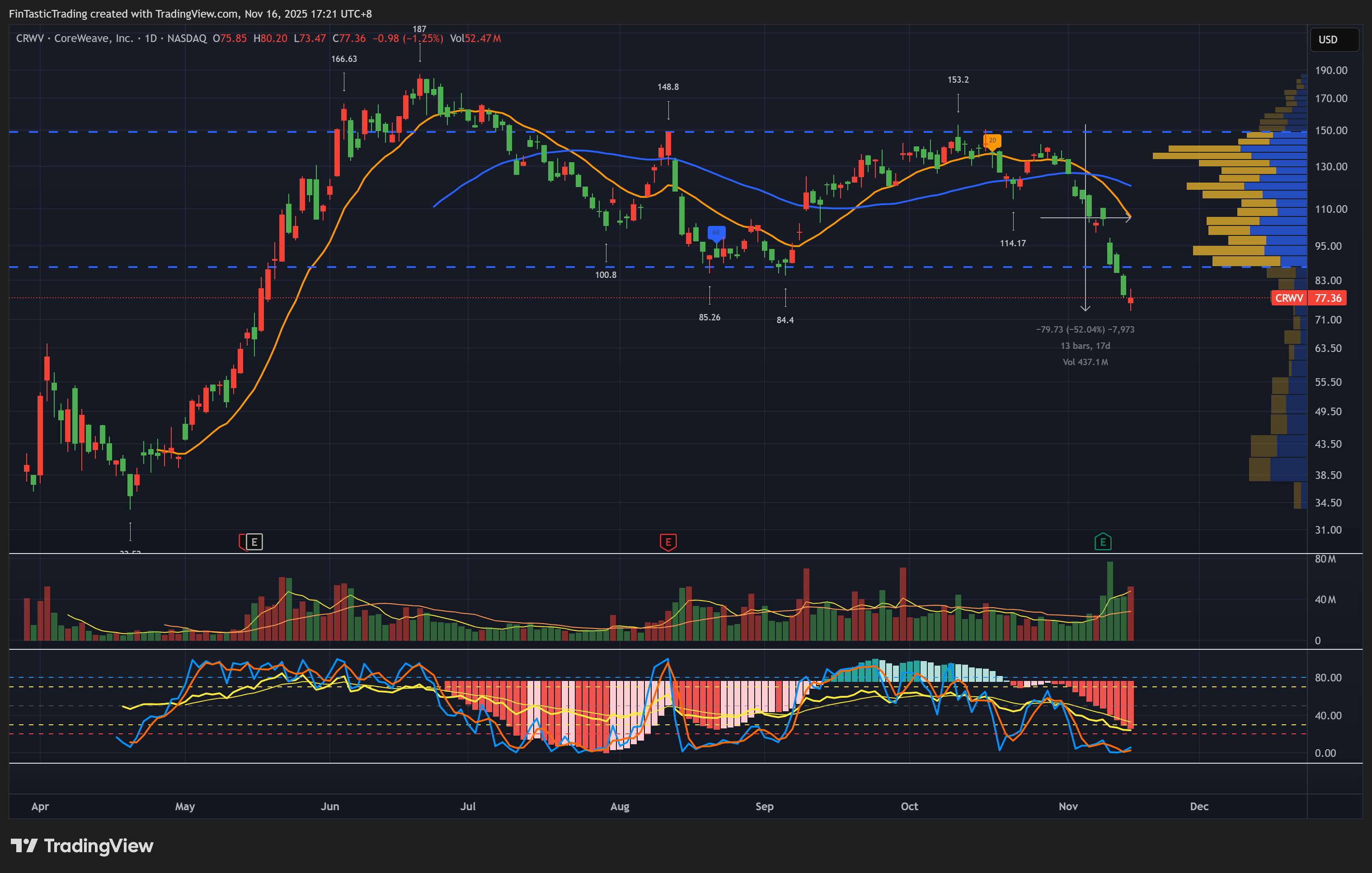 Q3 公布後,CRWV 隔天下跌16.31%,隨後4天累計最大跌幅接近 30%。自10月10日高點$151共向下修正最多52%。此次回檔甚至引起一波AI高Beta股票的集體大跌。