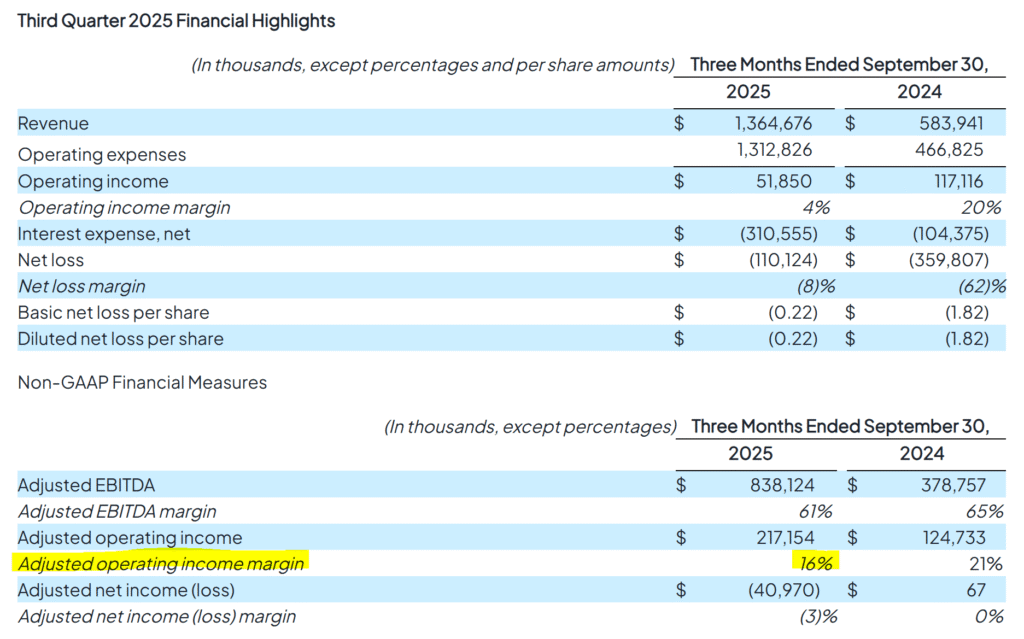 - CRWV Q3 調整後 OPM 只有 16%,全年指引推算 Q4 只剩 8–9%。