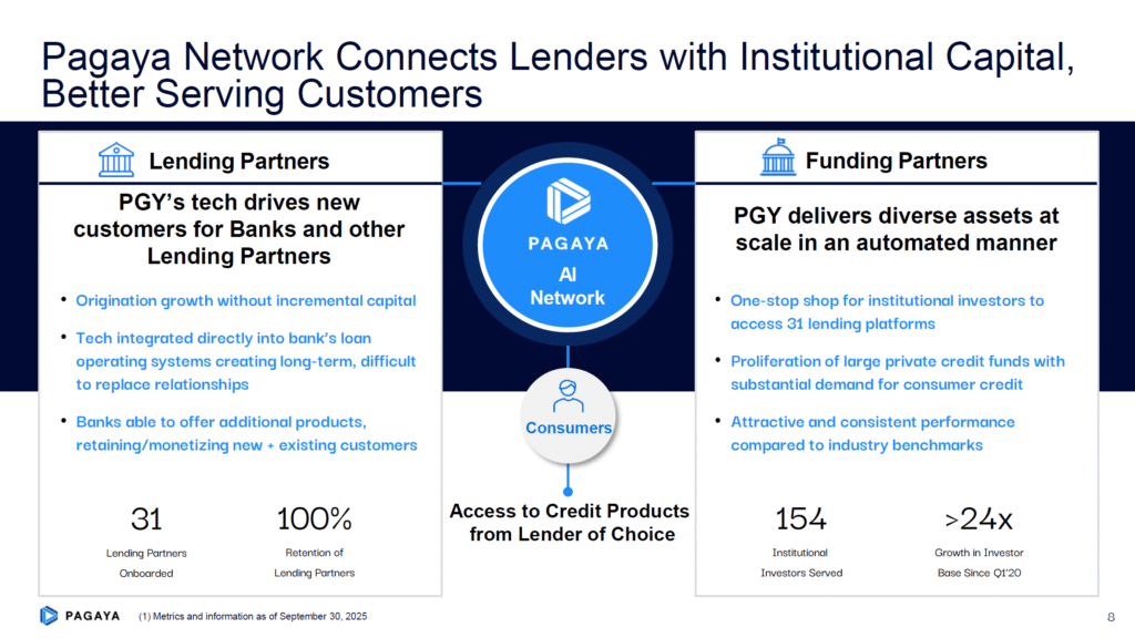 Pagaya的直接客戶是各類放款機構,包括銀行(如富國銀行Wells Fargo、道明銀行TD Bank等大型銀行近期亦與其合作)、信用卡發卡機構(如Ally信用卡部門)、線上消費金融公司、汽車金融公司等。截至2025年,公司已與31家放款機構建立合作關係。透過Pagaya,這些機構能夠觸及過去因風險政策而無法服務的客群,擴大業務量。同時Pagaya的最終服務對象涵蓋次級信貸(near-prime)為主的大眾消費者。Pagaya並不直接面向終端客戶做市場行銷,其放款量(Network Volume)來自合作夥伴的現有渠道,如銀行原有申請人以及第三方流量(Pagaya也與Credit Karma、LendingTree等流量端合作導流)。因此,其商業模式類似金融基礎設施提供商,以技術和資本網絡賦能傳統機構。這種模式使Pagaya的收入具有隨交易量變動的特性,而不像銀行有固定利差收入,需持續拓展夥伴與提高滲透率來增長。