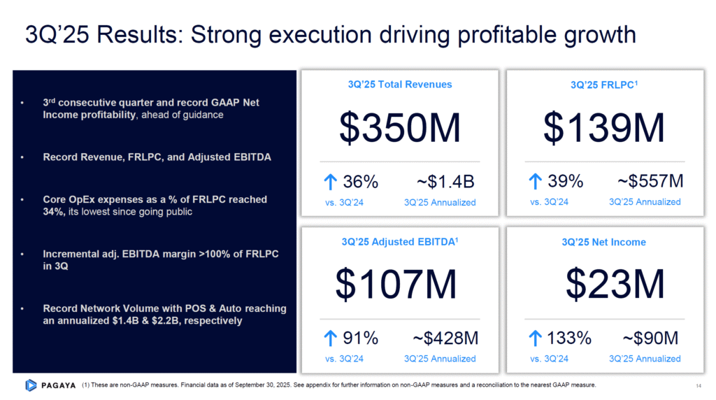 Pagaya 第三季大幅優於預期:營收 3.50 億美元(YoY +36%,創新高),核心費用收入 3.40 億(+36%)。放款量 28 億美元(+19%),但單位經濟更好——FRLPC% 提升到 5%,帶動營收成長快於放款量。