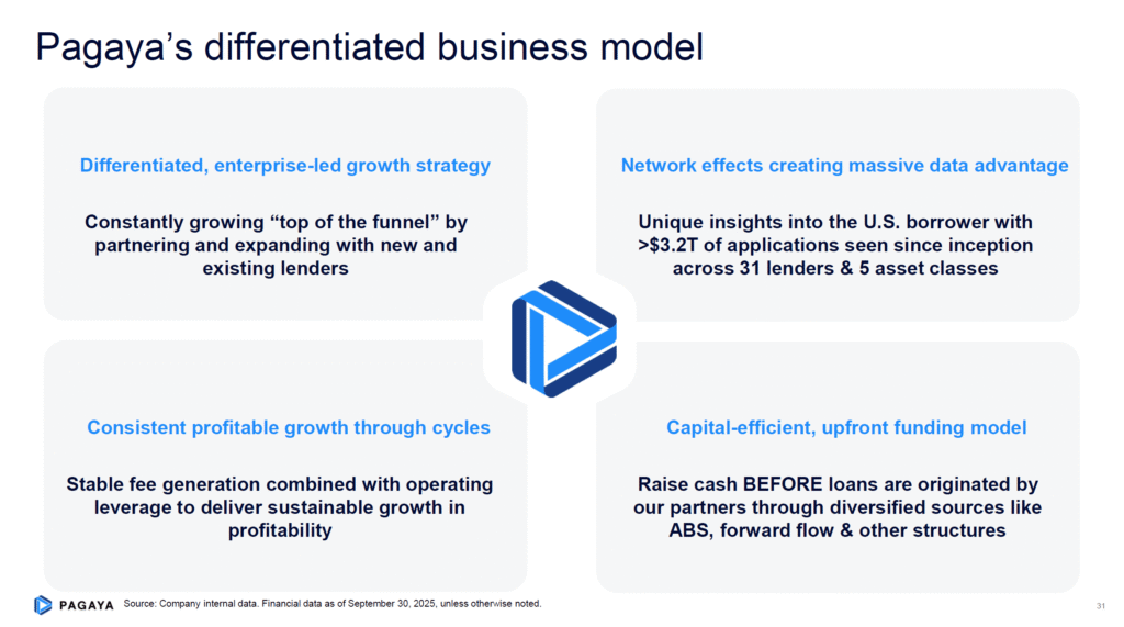 Pagaya 的多產品佈局已驗證有效。從個人貸款擴張到汽車、POS、信用卡風控後,只占約30%的多產品夥伴,卻貢獻超過三分之二的放款量;部分銀行在導入直效行銷/聯營流量等新模組後,對 Pagaya 的送件量瞬間放大(曾見約 +80%)。目前新產品已貢獻近半交易量,讓成長更靠「內生成長」與交叉銷售,而非只靠新增夥伴。好處是更深的場景滲透、黏著度更高、景氣循環下的韌性更強(不再依賴單一產品/單一利基)。