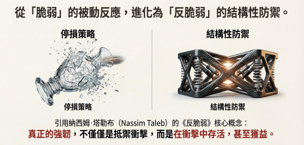 對於個人投資者而言,建立「反脆弱」體質的關鍵,不在於預測市場何時下跌,而在於為你的投資組合裝上一套「結構性的避震器」。這套系統能讓你在市場劇烈下跌時,資產淨值能有下跌緩衝,從而賦予你「調整的機會」與「抱得住」的底氣。