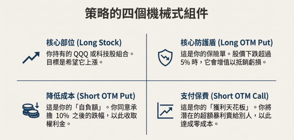 Put-Spread Collar 聽起來像是一個複雜的金融術語,但其核心邏輯非常簡單。它本質上是一個「零成本(或低成本)的保險計畫」。