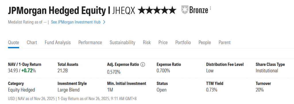 這種策略並非紙上談兵,全球規模最大的對沖股票基金之一——摩根大通對沖股票基金 (JPMorgan Hedged Equity Fund, JHEQX),資產規模超過 200 億美元,正是這一策略的忠實執行者。