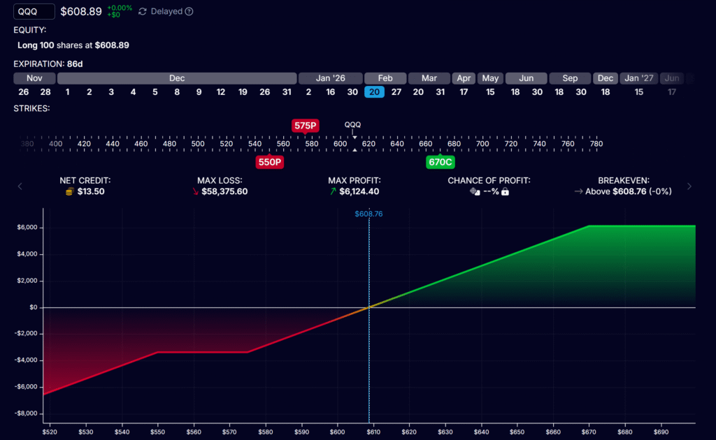 - 調整Short Call (賣出天花板):選擇同日到期,調整行使價,直到整個策略的 “Net Debit/Credit” 接近 $0。此時行使價約為現價 +10%。只要 QQQ 漲幅不超過 10%,你都能吃到完整漲幅。權利金收入用於支付Long Put。