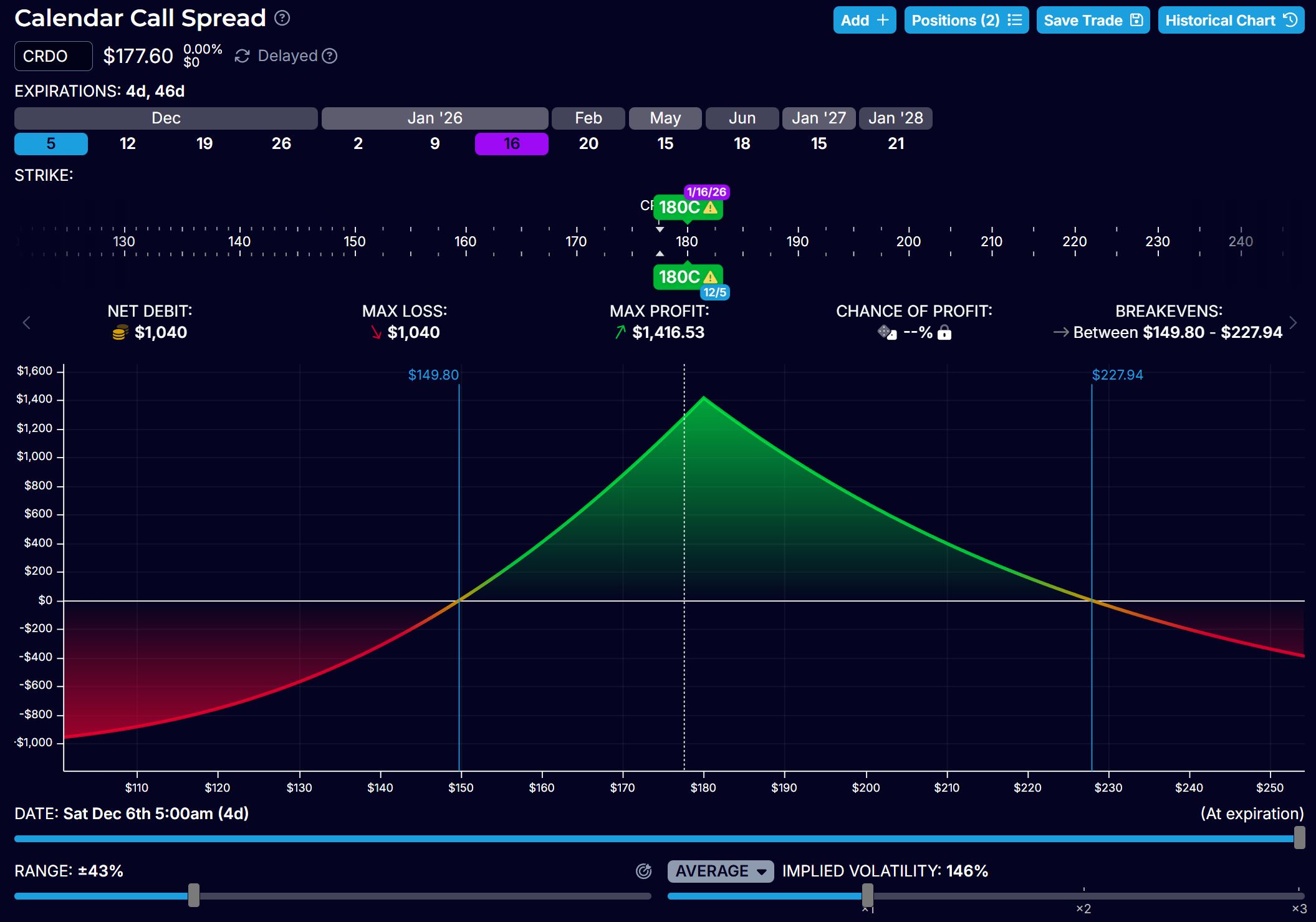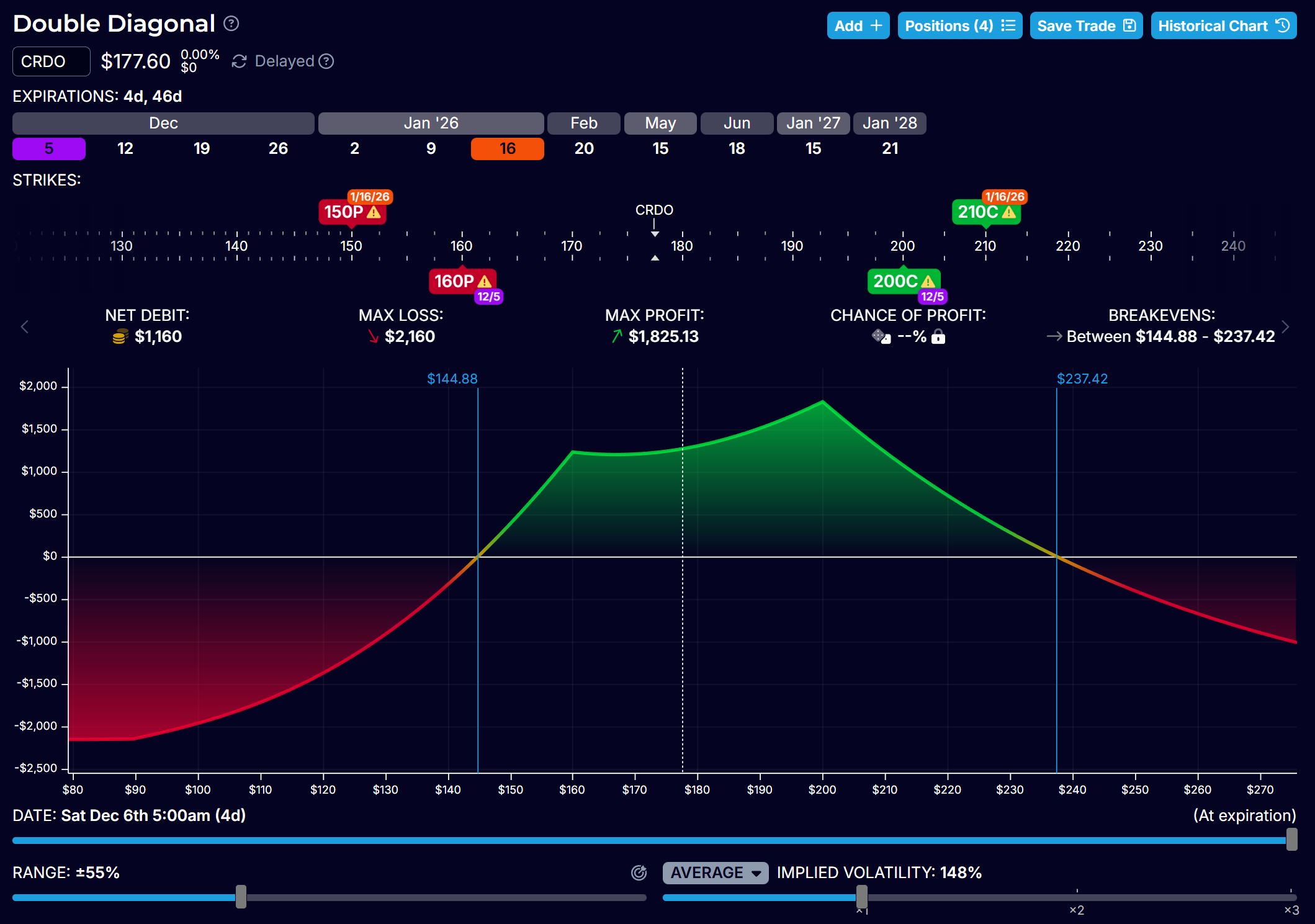- 損益兩平點 (Breakevens):區間驚人地寬廣,從 $144.88 到 $237.42。這意味著 CRDO 財報後即使大跌 18% 或大漲 33%,策略仍能獲利。