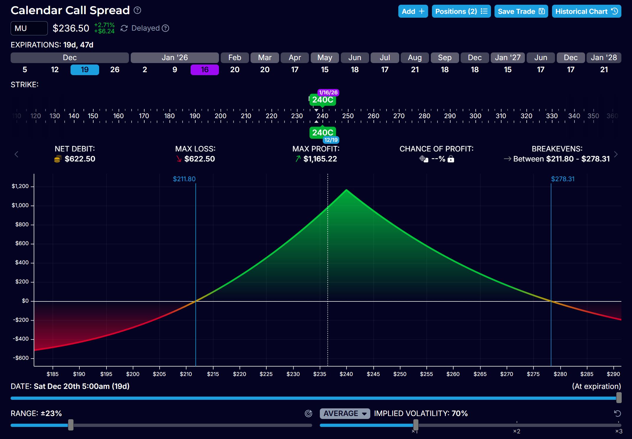 下圖展示了一個實際的日曆價差交易設置,標的為美光科技 (MU)。