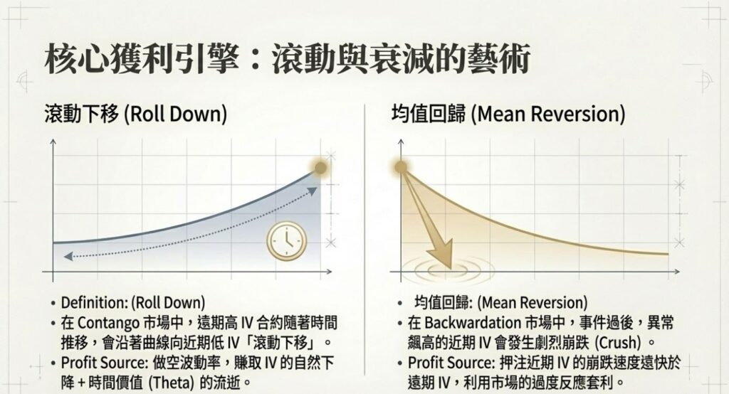 - 優勢原理 (The Edge): 由於遠期 IV 高於近期 IV,隨著時間推移,原本的遠月合約會逐漸變成近月合約。在市場情緒穩定的前提下,該合約的 IV 會沿著曲線「自然下降」。這種因為時間流逝而獲得的收益,稱為滾動收益 (Roll Yield)。