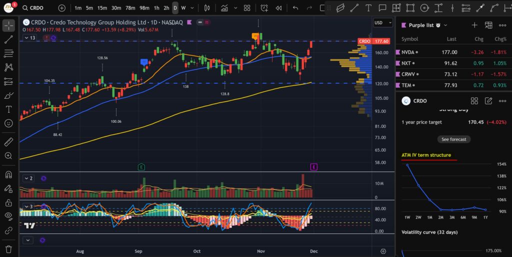 背景:Credo Technology (CRDO) 即將於 12/1 公布財報,當前股價 $177.60。Term Structure 呈現劇烈的 Backwardation(近月 IV 極高)。